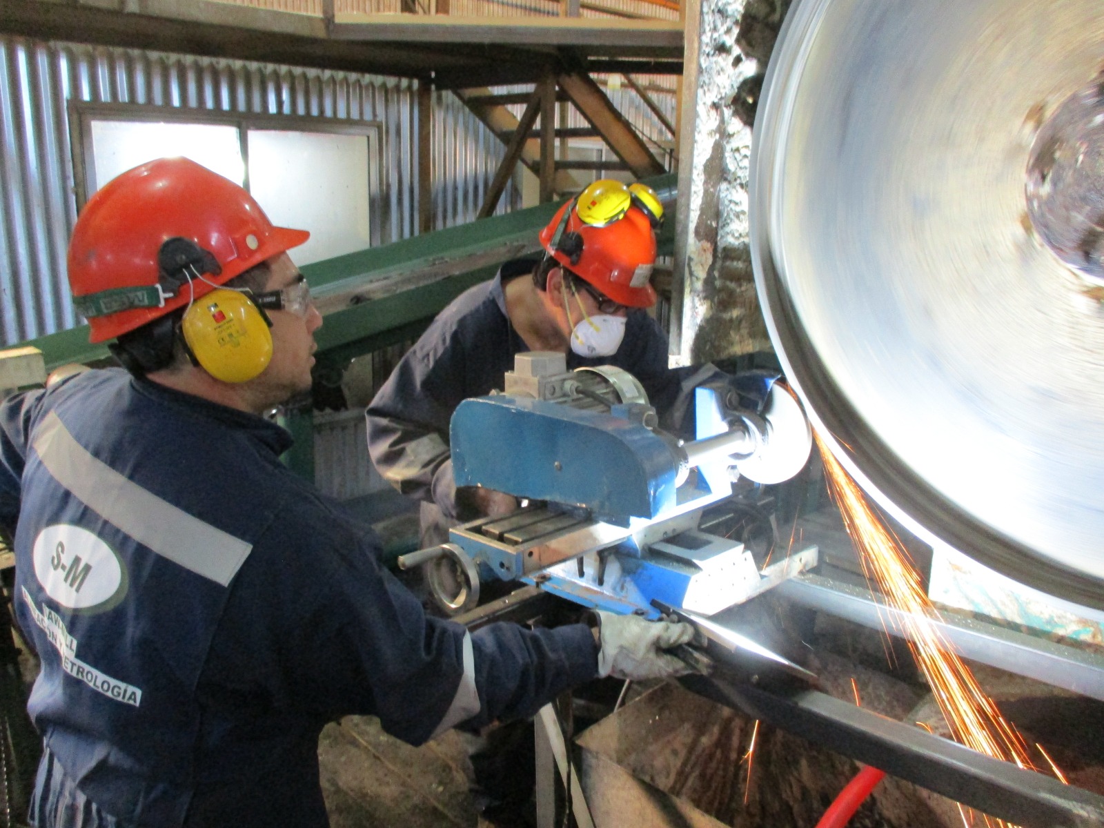 Rectificado y mantención mecánica de volantes de sierra huincha para operación segura y precisa.